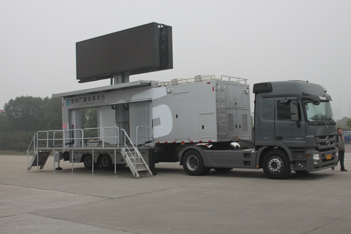 廂體右側(cè)為下翻式伸展平臺(tái),由液壓系統(tǒng)推動(dòng),周圍設(shè)有安全護(hù)欄,附有外掛懸梯,可供多人站立,并方便現(xiàn)場(chǎng)工作人員發(fā)布信息、開(kāi)展宣傳工作;